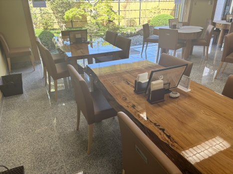美術館併設のカフェスペース。テーブルや天井等は屋久杉で作られていて、ガラス張りの店内からは日本庭園が望めます。