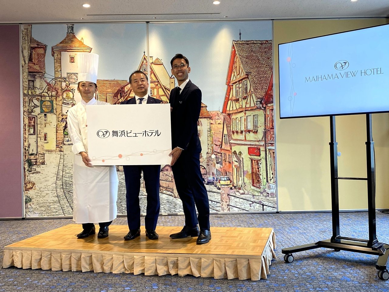 ヒューリックホテルマネジメント株式会社代表取締役社長:大町祐輔氏(中央)より挨拶、ホテル総支配人:鈴木裕樹氏(右)よりホテルコンセプト・施設紹介、 料理長:戸井田誠氏(左)よりリブランド記念メニュー紹介が行われました。
