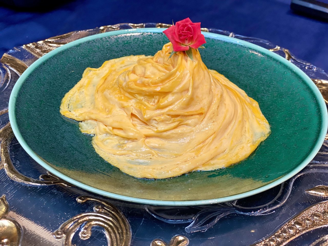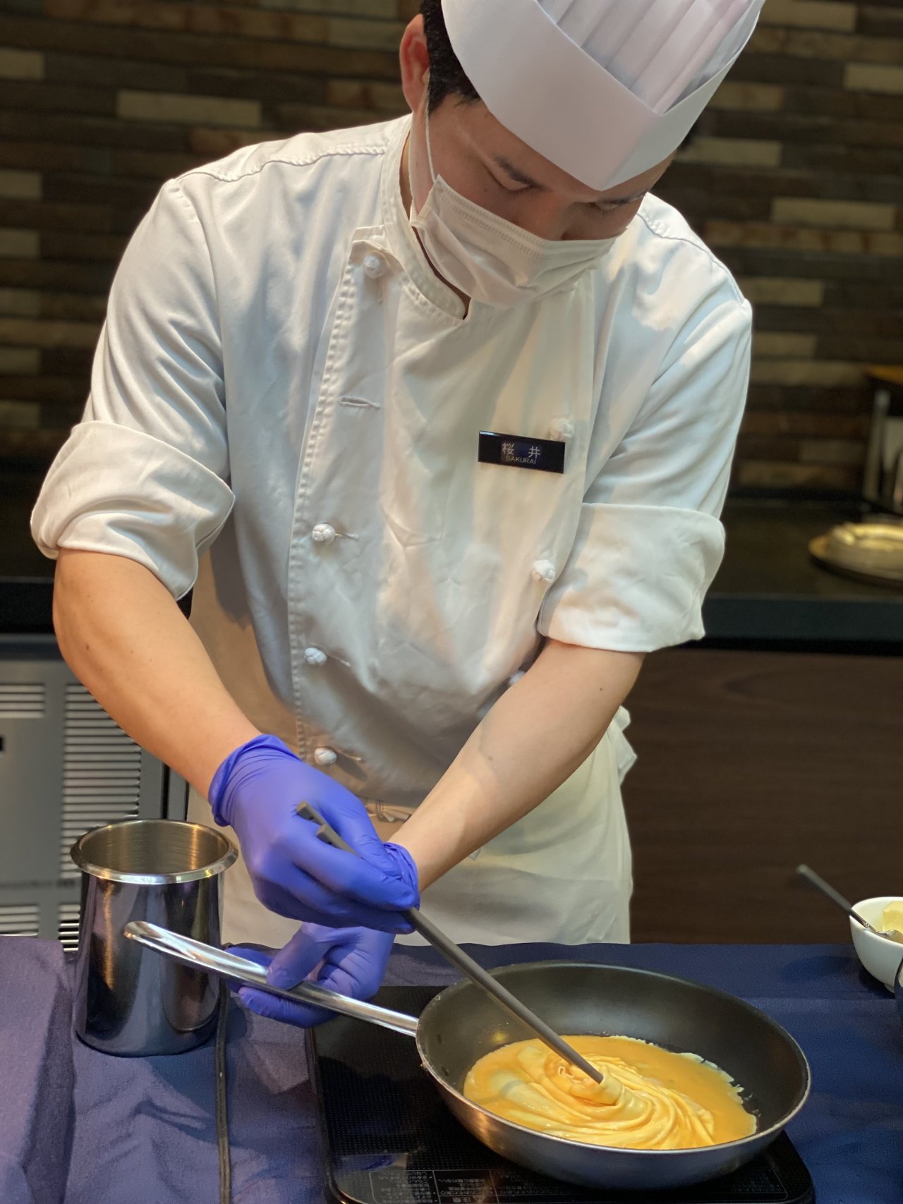 朝食で人気のシグネチャーメニュー「ドレス・ド・オムレツ」の実演。ふわとろのオムレツにバラを添えてドレスアップ!