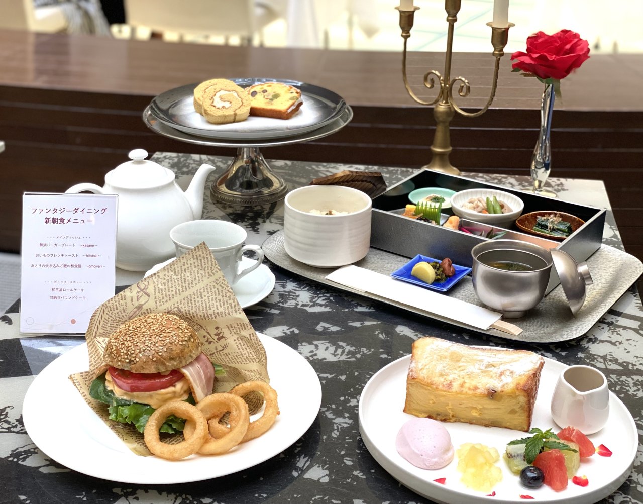 リブランドを記念した新メニューが登場。ファンタジーダイニングの新朝食メニューでは、あおさをバンズに使ったバーガーや、あさりの炊き込みご飯、おいものフレンチトーストなど、ここでしか味わえないお料理が楽しめます。