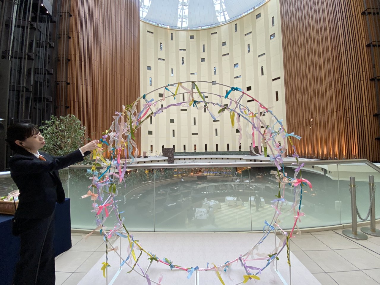 ゲスト参加型アート「つながる色、つむぐ想い」。色とりどりのリボンをゲストに結んでいただき、華やかな円のアートをみんなで完成させます。