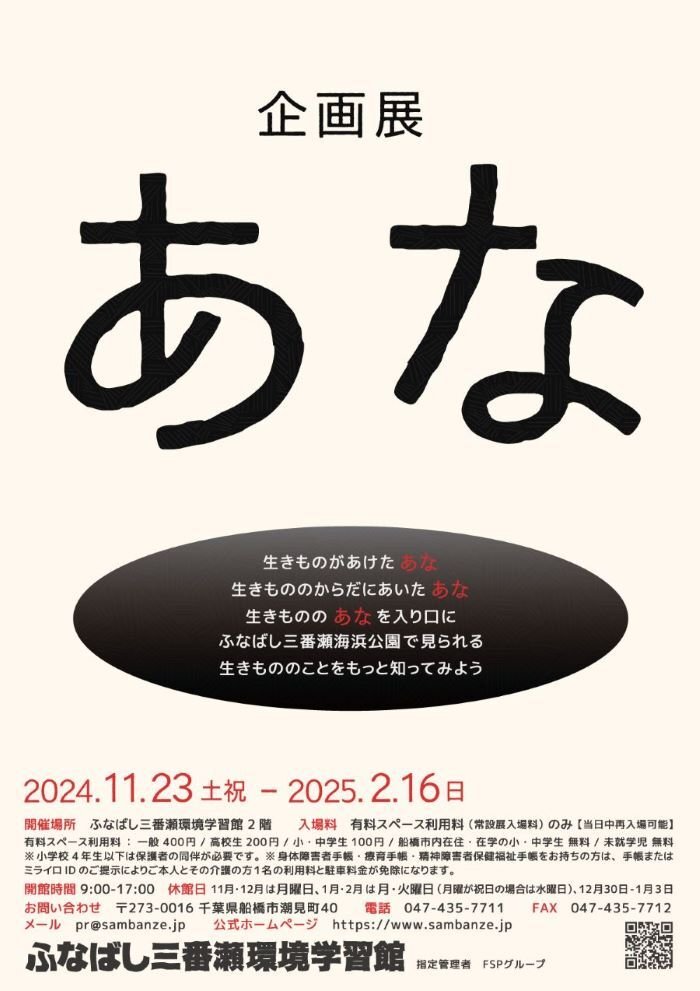 東京湾に面するふなばし三番瀬海浜公園には、よく見ると色々な 「あな」があります。生きものがあけた「あな」、生きもののからだに あいた「あな」。企画展では、生きものの「あな」を入り口に、生態や からだのしくみ、見つける手がかりをわかりやすく紹介。生体展示、 標本、動画など楽しい展示のほか、「貝がら&ビーズ工作」などの ワークショップも開催しているのでぜひ!