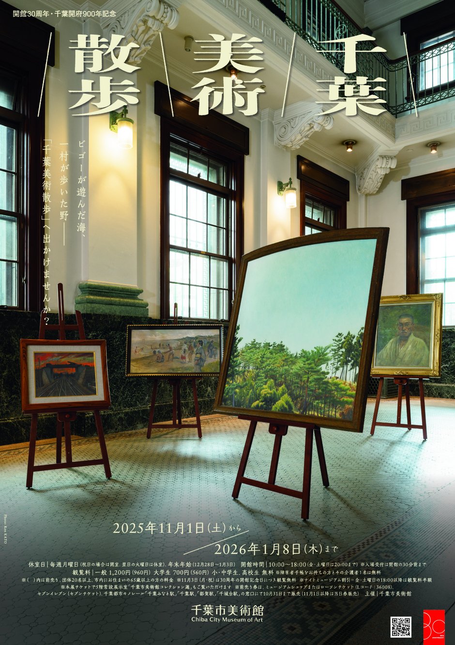 開館30周年を記念し、千葉という「場」をテーマとする展覧会を開催。時代は明治期から現代まで「場」はジョルジュ・ビゴーの滞在や海気館で知 られる稲毛、黎明期の洋画家・堀江正章が指導を行った旧制千葉中学校、 画家・無縁寺心澄が描いた市内の建物や風景、戦後の千葉アートシーンの 一拠点となった国松画廊など。また、お散歩ツアー「てくてく千葉美術散 歩(事前申込制)」やワークショップなど、関連イベントもおすすめ。