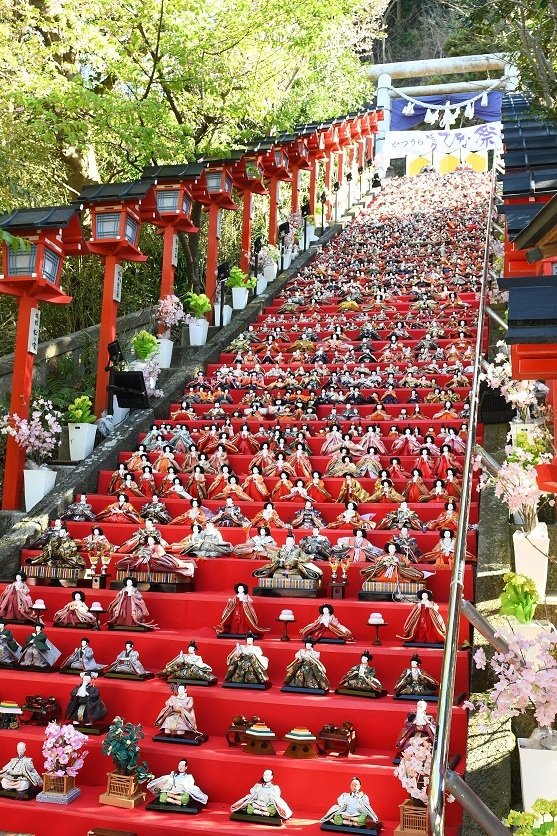 勝浦市の神社仏閣や街の商店、郵便局にまで、全国から寄贈されたひな人形が飾られ、街を華やかに彩る。なかでも遠見岬神社の石段60段に並ぶ約1,800体のひな人形は圧巻!また、キュステでは、カラフルな七色の雛壇や、日本最大級の享保風雛など多彩なひな人形が楽しめ、大ホールの7,000体もの特設雛壇は迫力満点!