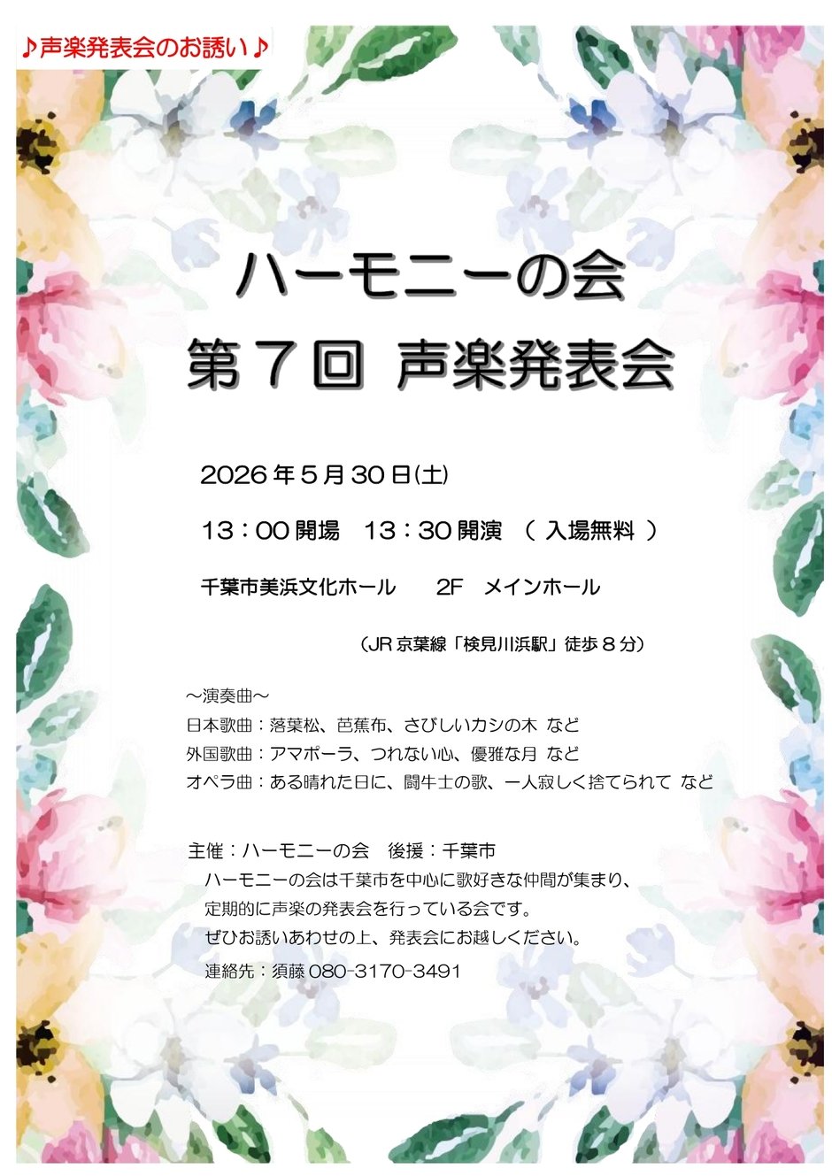 | お問い合わせ | TEL:080-3170-3491 担当:須藤 主催:ハーモニーの会 後援:千葉市 |