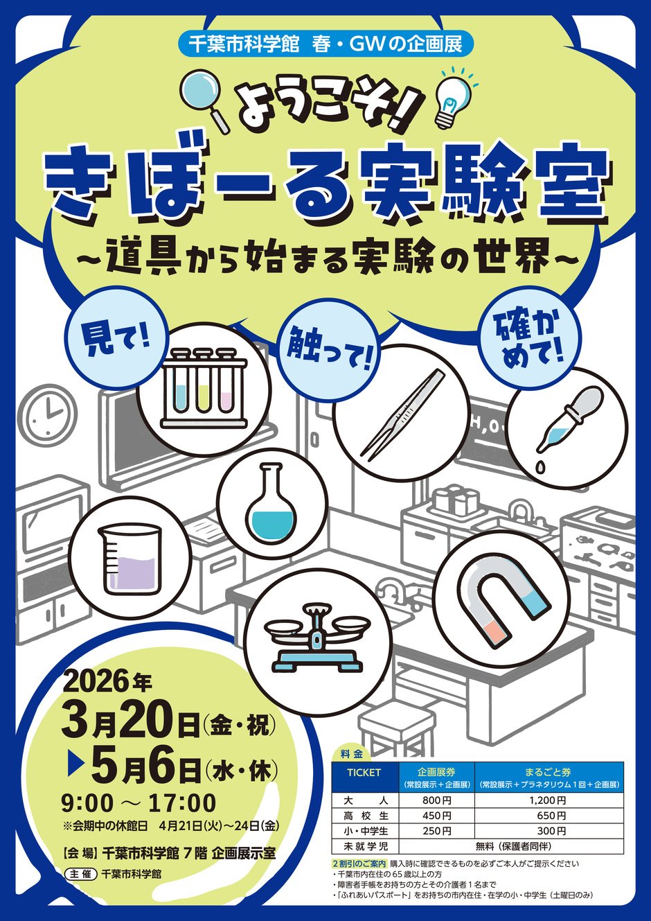 千葉市科学館では、3月20日(金・祝)より春・GWの企画展 『ようこそ!きぼーる実験室~道具から始まる実験の世界~』 を開催します。