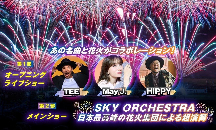 総合演目は花火エンタテインメント「SKY ORCHESTRA」。第1部『LOVE & YELL』では、アーティストの生歌と花火がシンクロするLIVE×花火をお届け♪第2部『SKY ORCHESTRA ~日本最高峰の花火集団による超演舞~』では、全国約20社の花火制作チームにより、最大尺玉を含む花火を音楽と1/30秒単位で同期させ、空間全体を使ったストーリー型花火を体験できます。SBI舞花火として稲毛の浜で初開催となる、記念すべき花火エンタテインメントをぜひ間近でご覧ください。