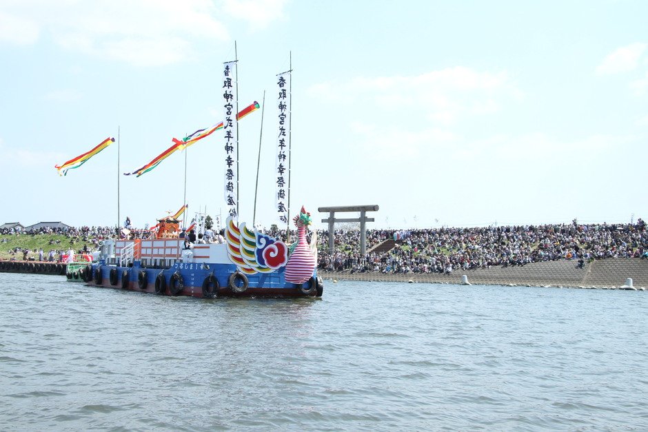 12年に一度、午年に開催される「式年大祭」では、天皇陛下より御幣物(神前への捧げ物)が奉られ、勅使による祭文奏上ほか、雅楽や神楽舞の奉奏も執り行われる。また、「式年神幸祭」は、御神輿を中心に時代装束の氏子や楽隊など約3千名の大行列が佐原の町並みを巡行。津宮浜鳥居から御神輿を乗せた御座船が利根川上を進む様は圧巻で、河川上の「水上祭」や、鹿島神宮の御