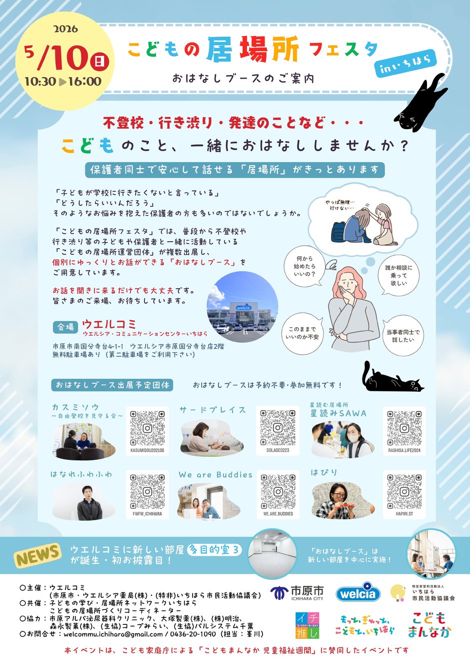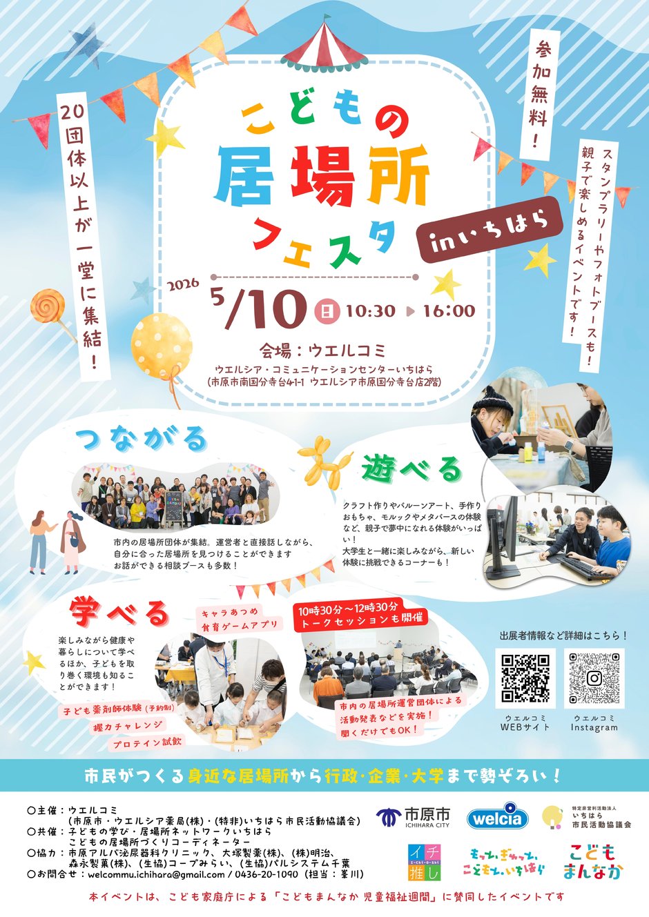 「こどもの居場所フェスタinいちはら」は、市原市内を中心にこどもの居場所づくりに取り組む市民活動団体、地域活動に取り組む企業、行政の協働によるイベントです。今回は3つの大学の学生たちも初参加し、こどもたちと一緒に体験できる企画やブース運営を行います。