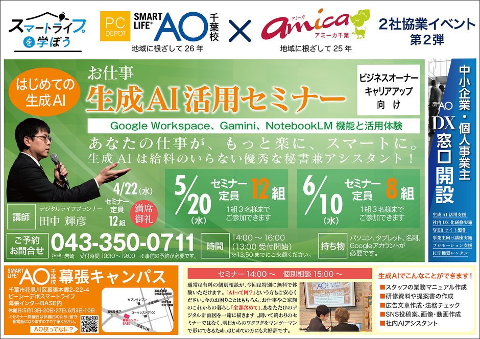 | 時間 | 5/20(水)幕張キャンパス14:00~16:00 6/10(水)幕張キャンパス14:00~16:00 ※要事前予約 |