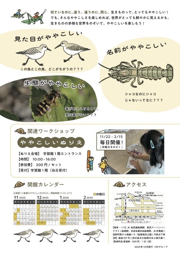 東京湾沿いに広がる干潟「三番瀬」には、さまざまな生きものが生息。企画展では「見た目がややこしい」「名前がややこしい」「生態がややこしい」など、ややこしい生きものについて詳しく紹介。生きものの多様な世界をのぞいて、ややこしいを楽しもう!ワークショップ「ややこしい ぬりえ」(200円/10:00~16:00当日受付)も毎日開催するのでぜひ