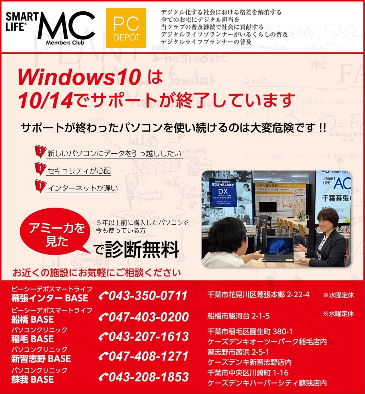 5年以上前に購入されたパソコンを今も使っている方は要注意です!!ぜひ、お近くのピーシーデポ スマートライフへお電話ください!