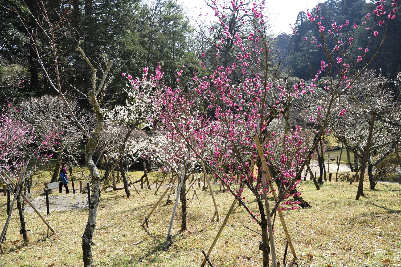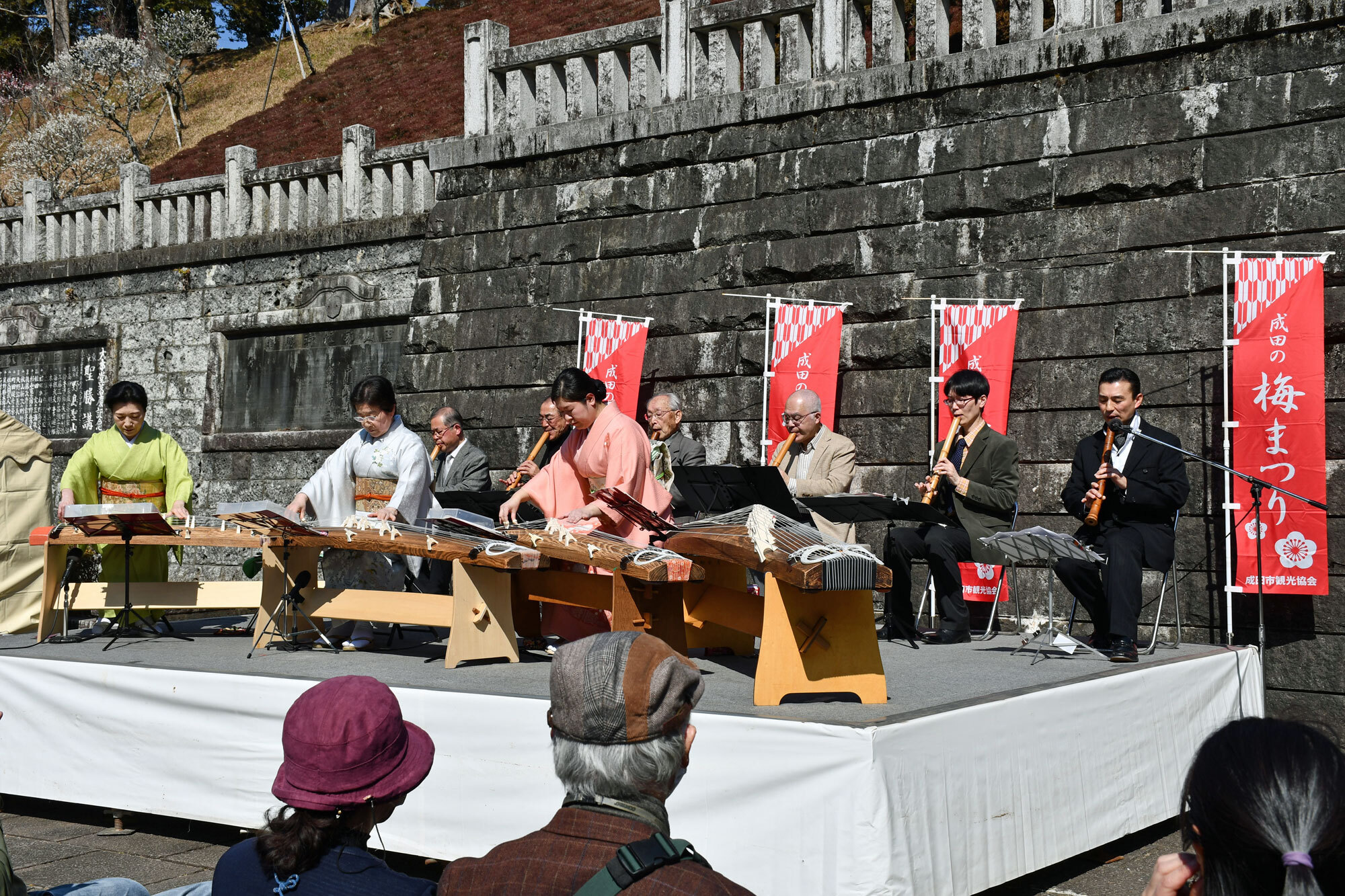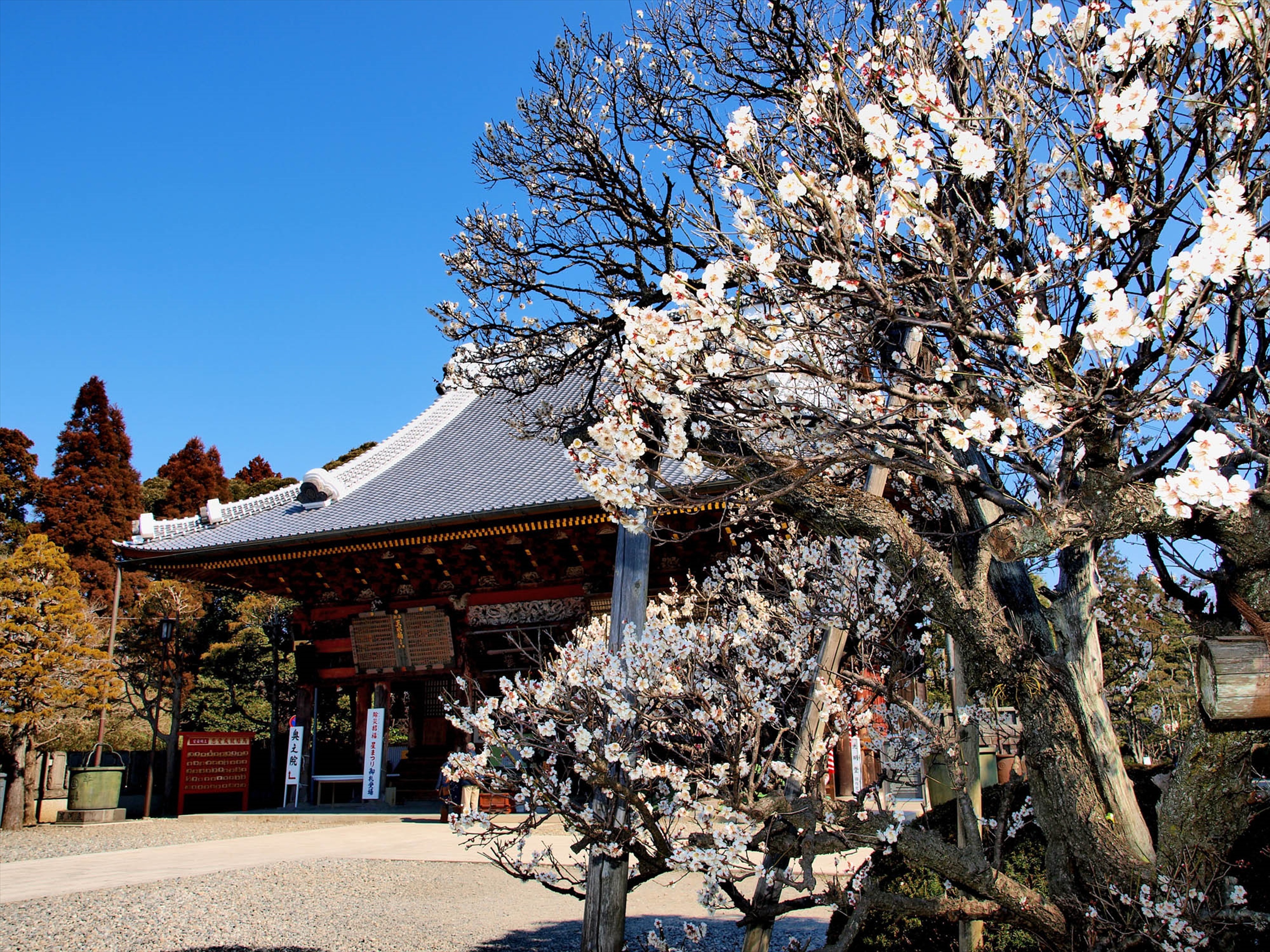 成田山新勝寺境内の大本堂後方に広がる大庭園には、紅白の梅木約360本が植えられ、平均樹齢70年を超える古木の気品のある花が楽しめる。まつり期間中の土日には、野点や甘酒の進上、津軽三味線、箏・尺八、二胡の演奏会などを開催。