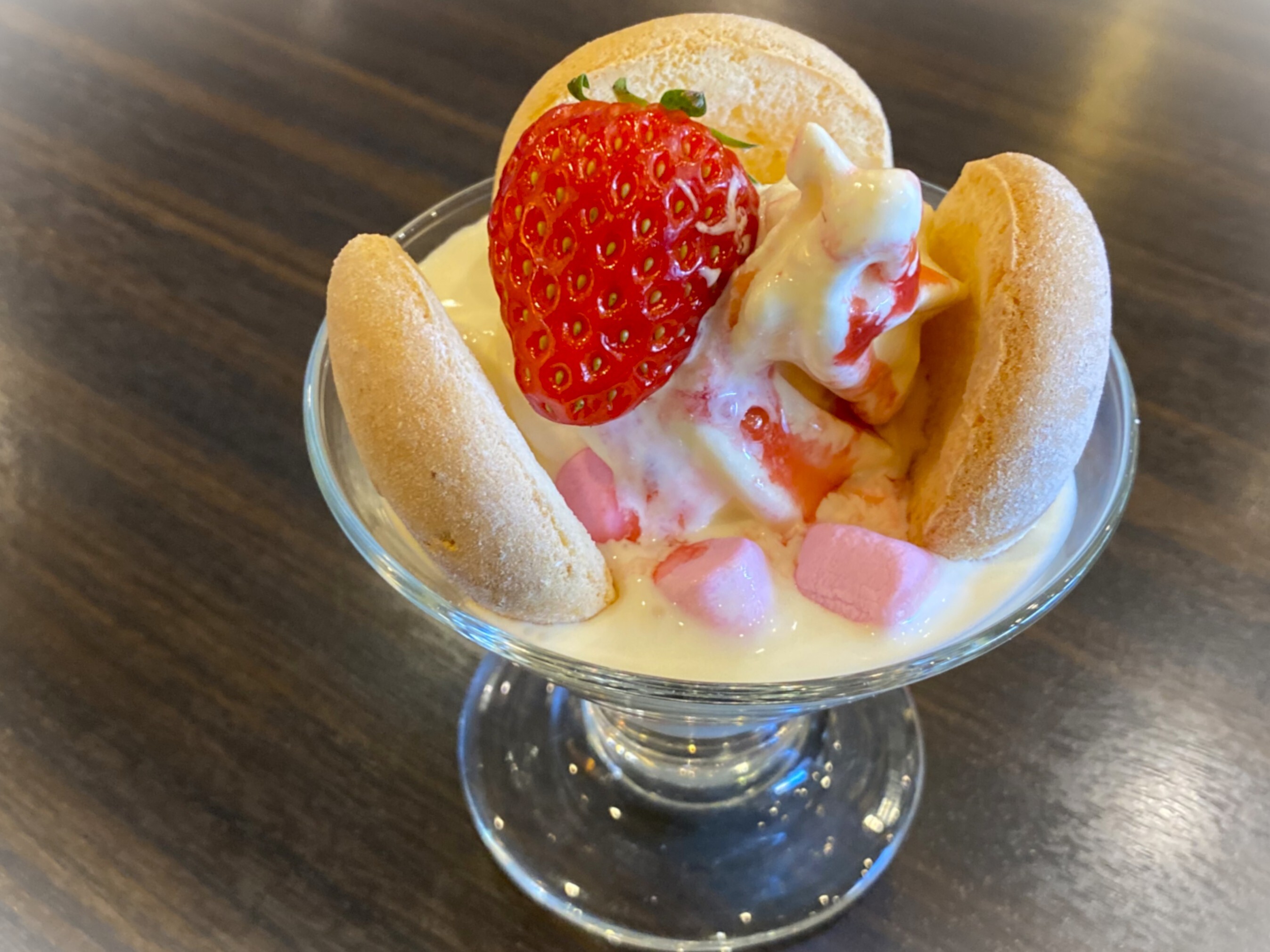 濃厚なミルクソフトクリームに、クリームチーズ香るホテル特製のブッセといちごを飾って、自家製ストロベリーコンフィチュールをトッピング。ミルクといちごの贅沢なハーモニーを楽しめます。特製ブッセは主役級のおすすめの逸品なので、ぜひ!