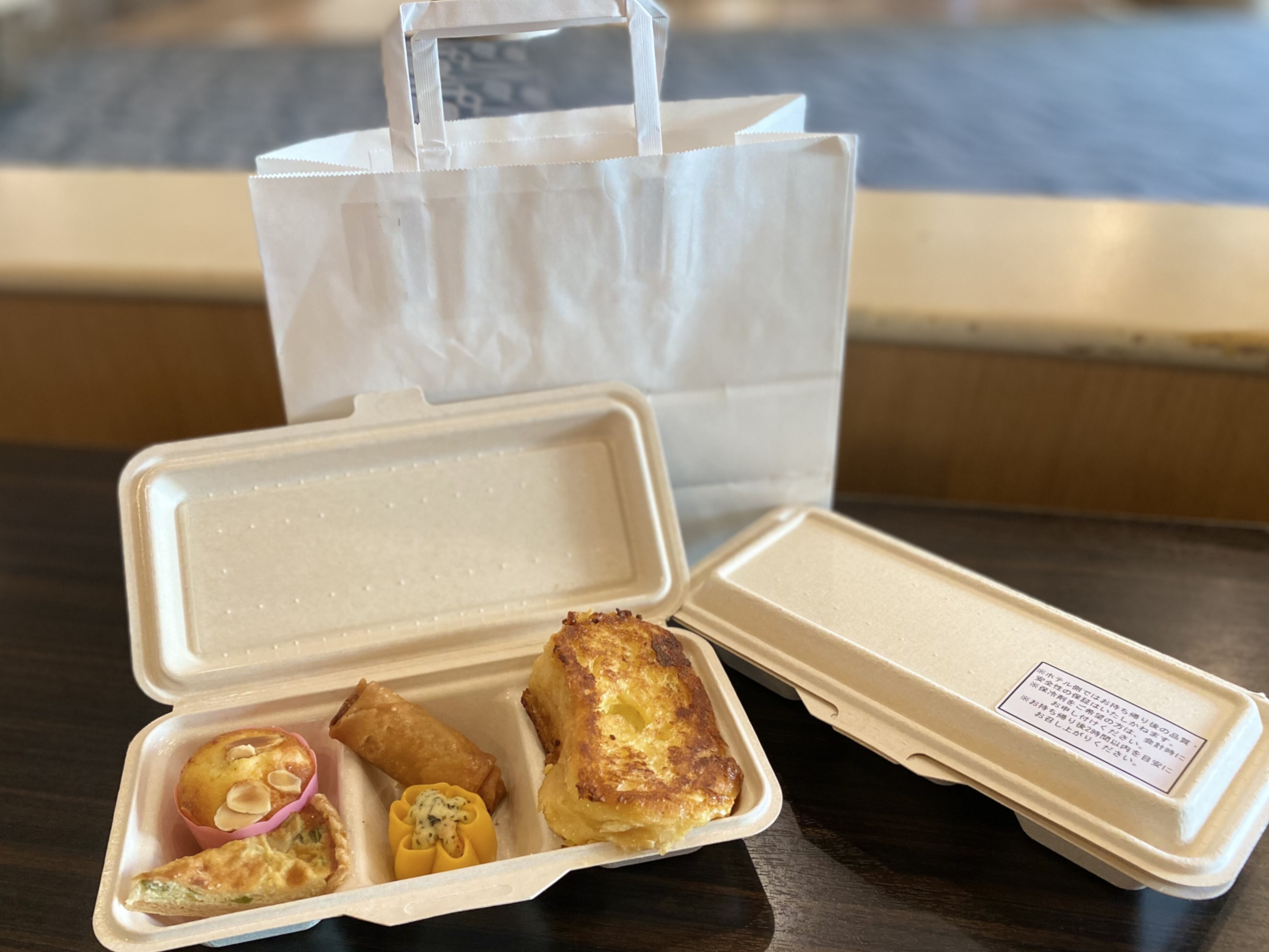 ランチビュッフェ・ヒルトンブランチの2部ご利用の方限定で、15:00に 大人1名様につき「エシカルボックス」1箱をお渡しし、お皿に残された料理やビュッフェ台の未消費の料理を専用のボックスに入れて持ち帰ることができるサービスを提供。