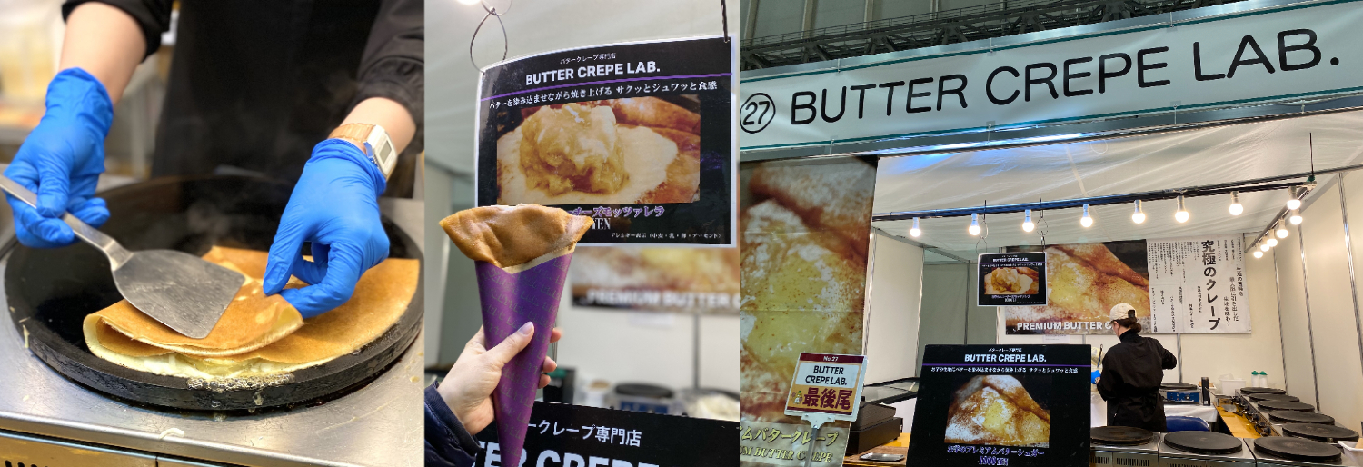 バターを染み込ませながら焼き上げたサクジュワ食感のバター生地に、モッツァレラチーズ、自家製スイートポテト、ハチミツで仕上げた究極のクレープは満足度大!